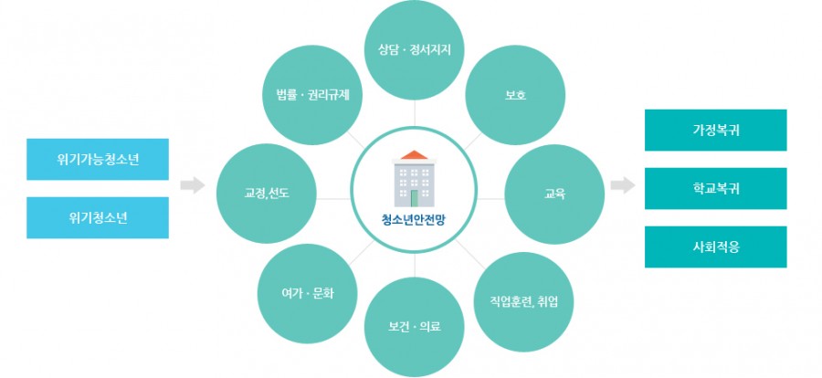청소년안전망 청소년안전망은 다양한 자원(경찰청, 교육청, 학교, 쉼터 및 복지시설 등)과 연계하여 청소년들이 경험하고 있는 다양한 위기 상황에 대한 전문적인 분석과 맞춤형 서비스를 지원하여 건강한 일상으로의 회복을 지원합니다.